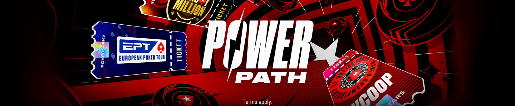Power Path is a four step qualification route to Bronze, Silver and Gold Power Path Passes that runs from June 26, 2023 until further notice. PokerStars will provide a reasonable notice of when Power Path will come to an end. In addition to these prize terms and conditions, the General Terms and tournament rules governing the participation in tournaments on the PokerStars website apply to player’s participation in the Power Path.